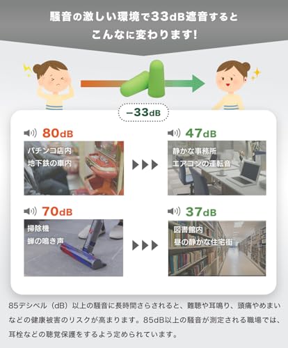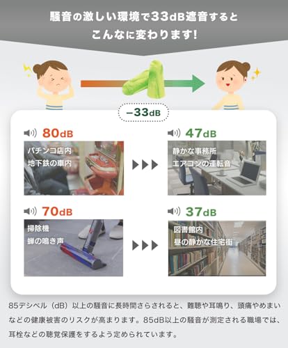 フォームの種類によって遮音性能は異なりますが、NRR(アメリカ・カナダ規格)で30〜33dB/SLC80(オーストラリア・ニュージーランド規格)で25〜28dBのものが多いです。