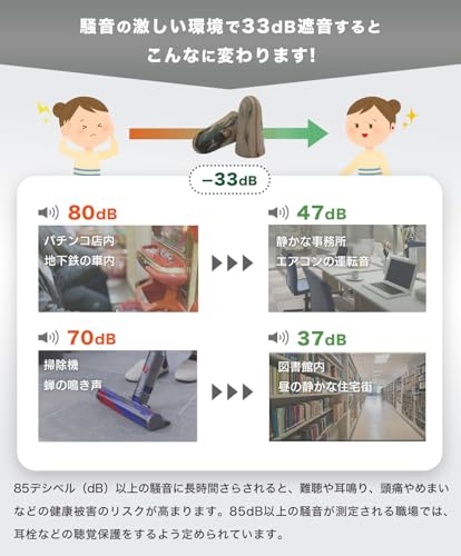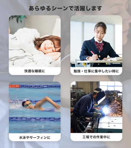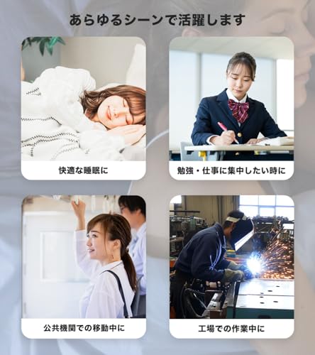 高い遮音性と快適なフィット感によって睡眠、勉強、騒音対策(工事の音、バイク、サイレンなど)に適しています。
