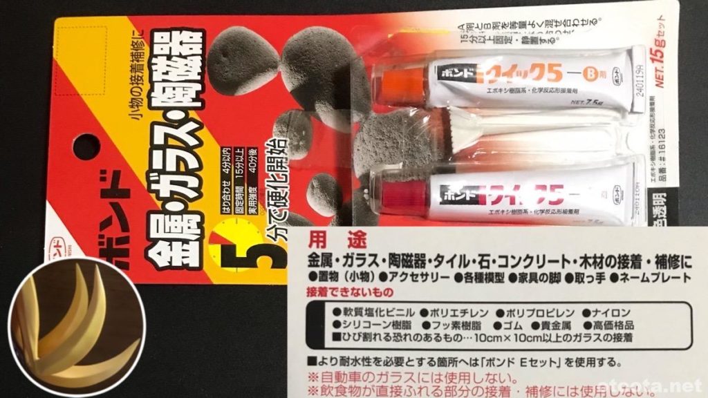 • 2種混合のエポキシ接着剤:2種混ぜない限り硬化しないので数年後も使えます