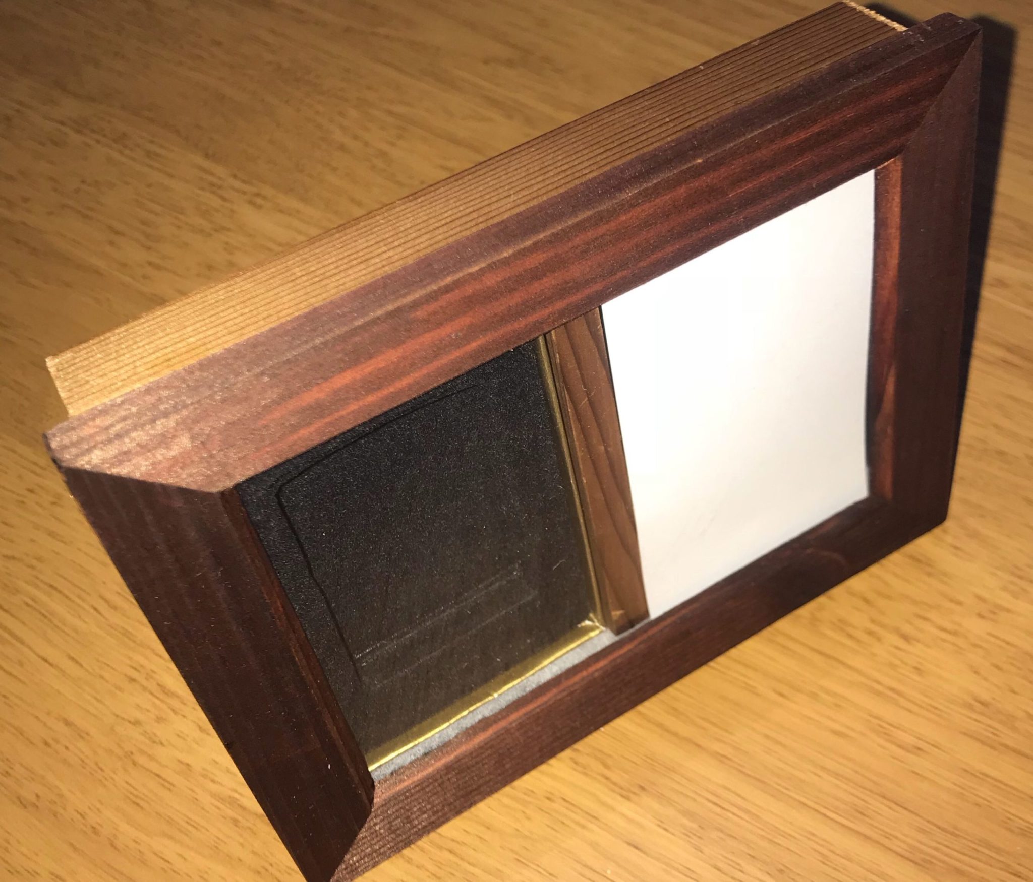 ①写真たての外枠では無く裏蓋のサイズを基準に奥行きを作っているため張り合わせる時は外枠の外周ではなく、内周あるいは裏蓋を目安に。