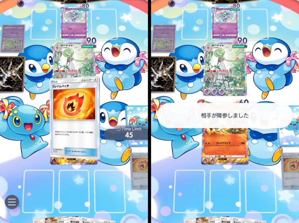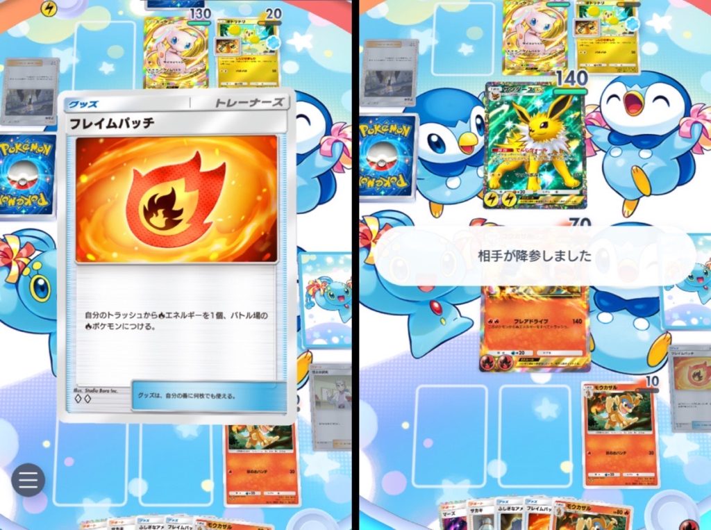 相手のデッキが圧迫してそうな構成に感じますが、大きなマントを付けられて回復されてたらスイクンを一撃で倒せなかったですね。