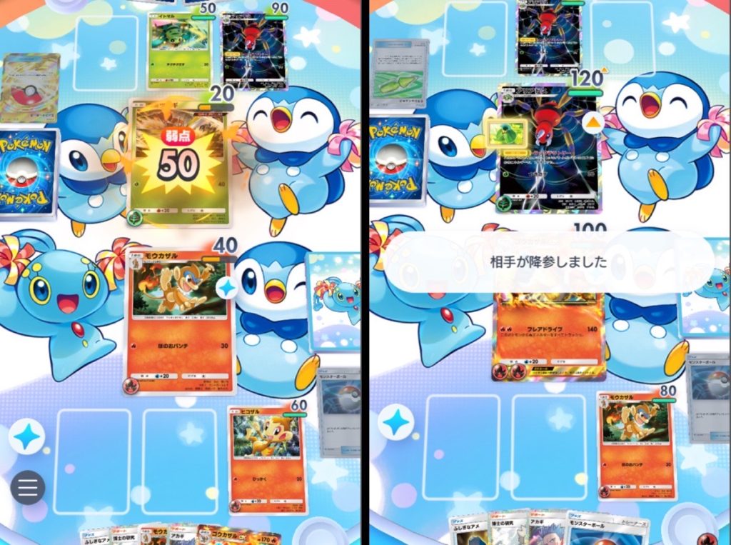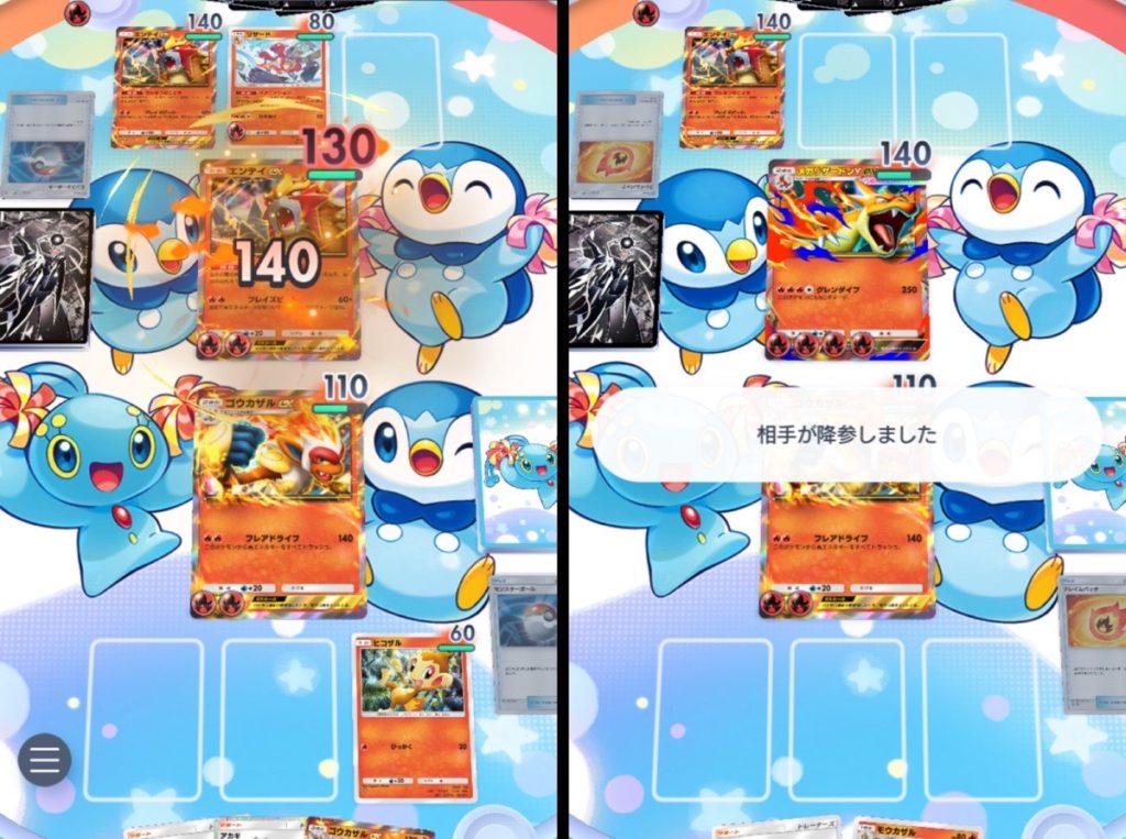 相手が先攻の初手オドリドリだったので1〜2ターン目のヒコザルとモウカザルで計50ダメージ蓄積。