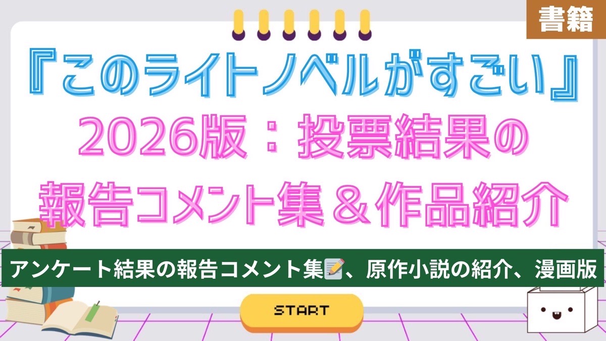 この記事では、投票者がおすすめするラノベ作品のアンケート『このライトノベルがすごい!2026』の結果発表を受けた各作品の報告コメントと、原作小説の紹介および漫画版(コミカライズ)、このラノ2026時点のアニメ化の有無をまとめています。