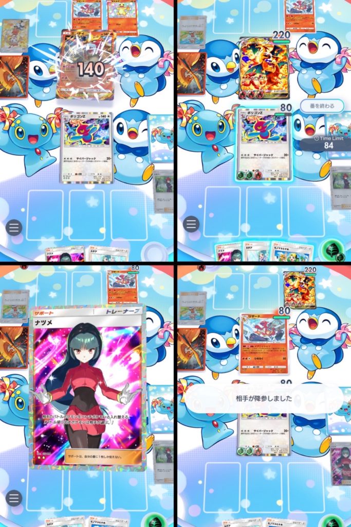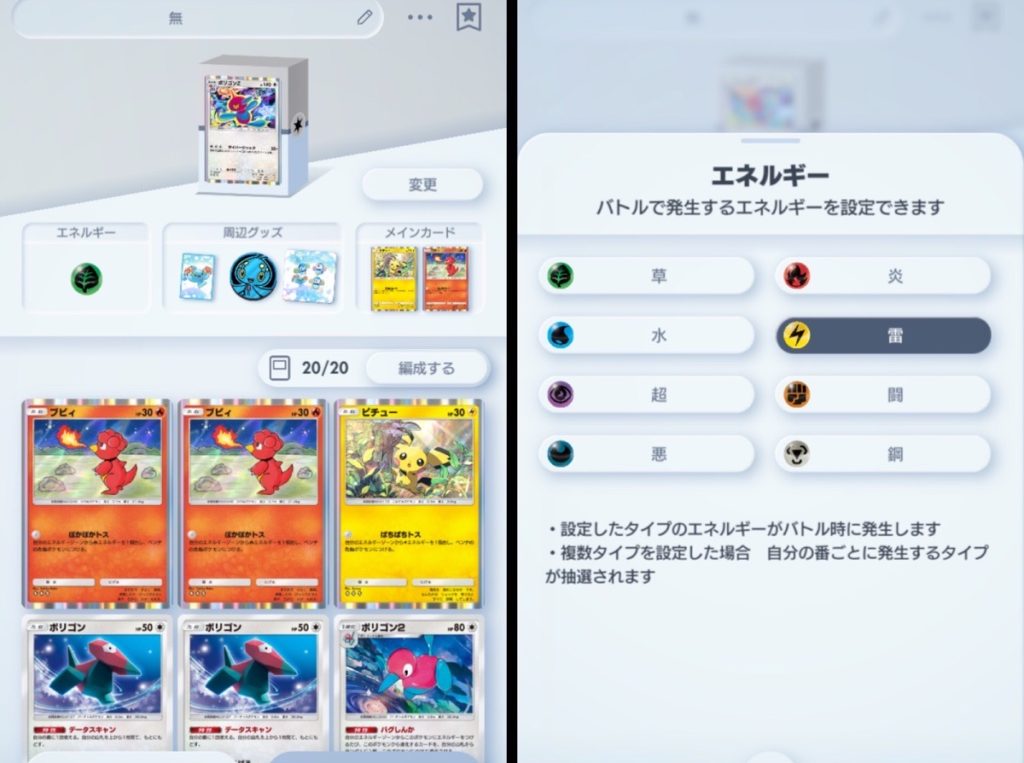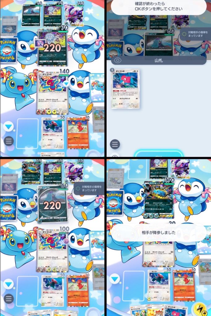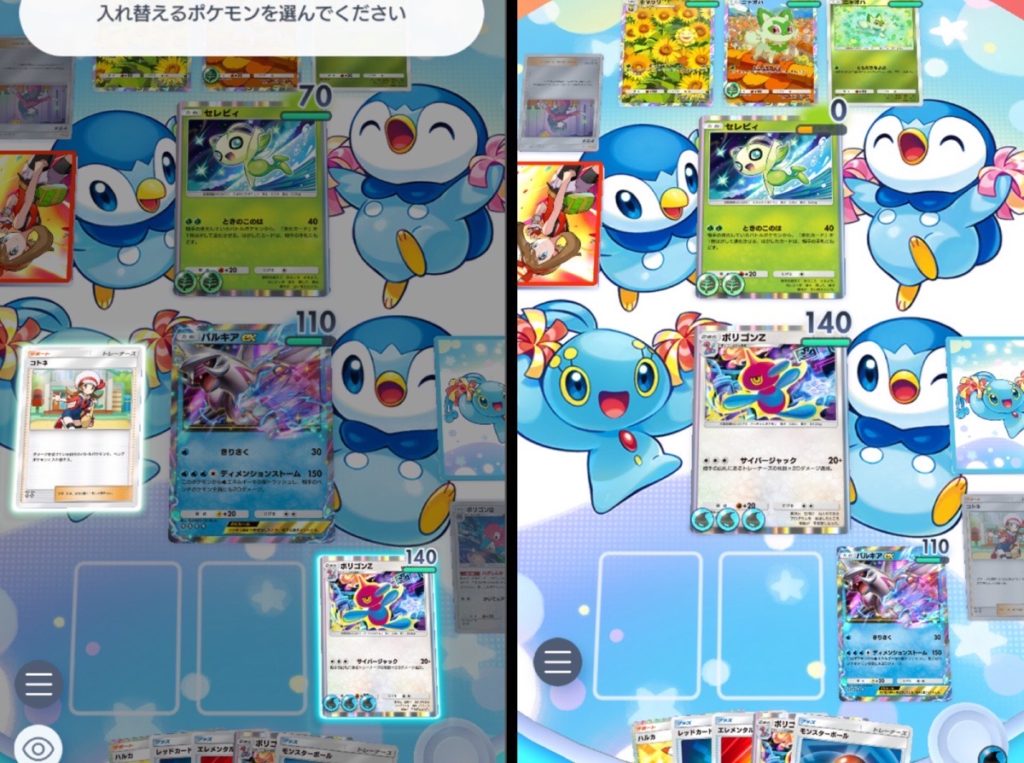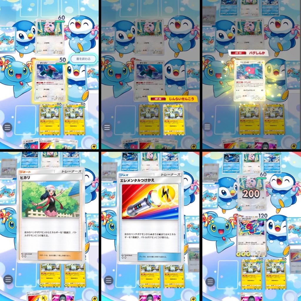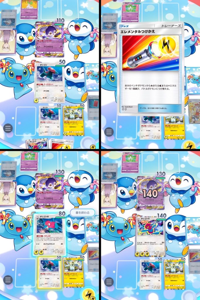 後攻2ターン目にポリゴン2に進化してから手貼りをすれば、ポリゴンZ(3エネ)になるため、後攻の場合は、エレメンタルつけかえやカスミを使わずに最短ムーブが可能です。