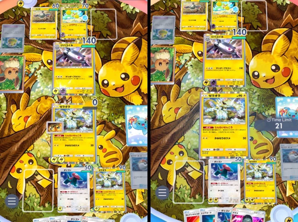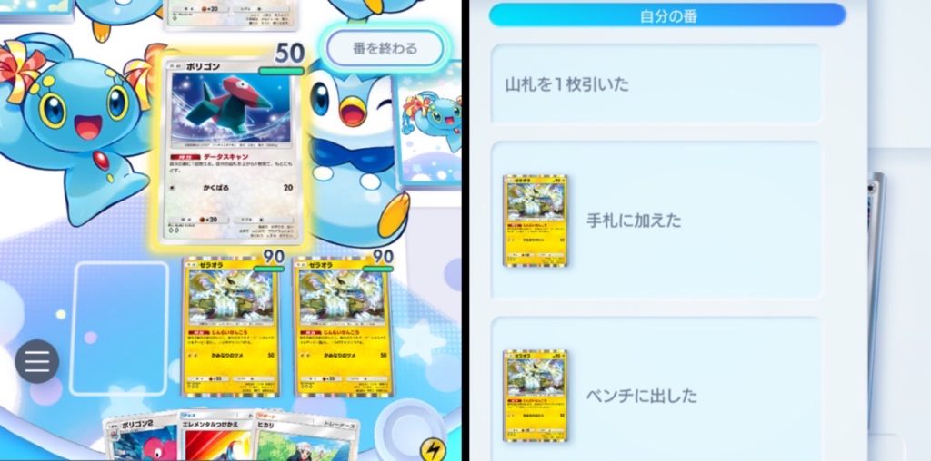 0エネ技のピチューでポリゴンに1エネを貼り、ゼラオラは特性で自身に1エネを付けて1ターン終了。