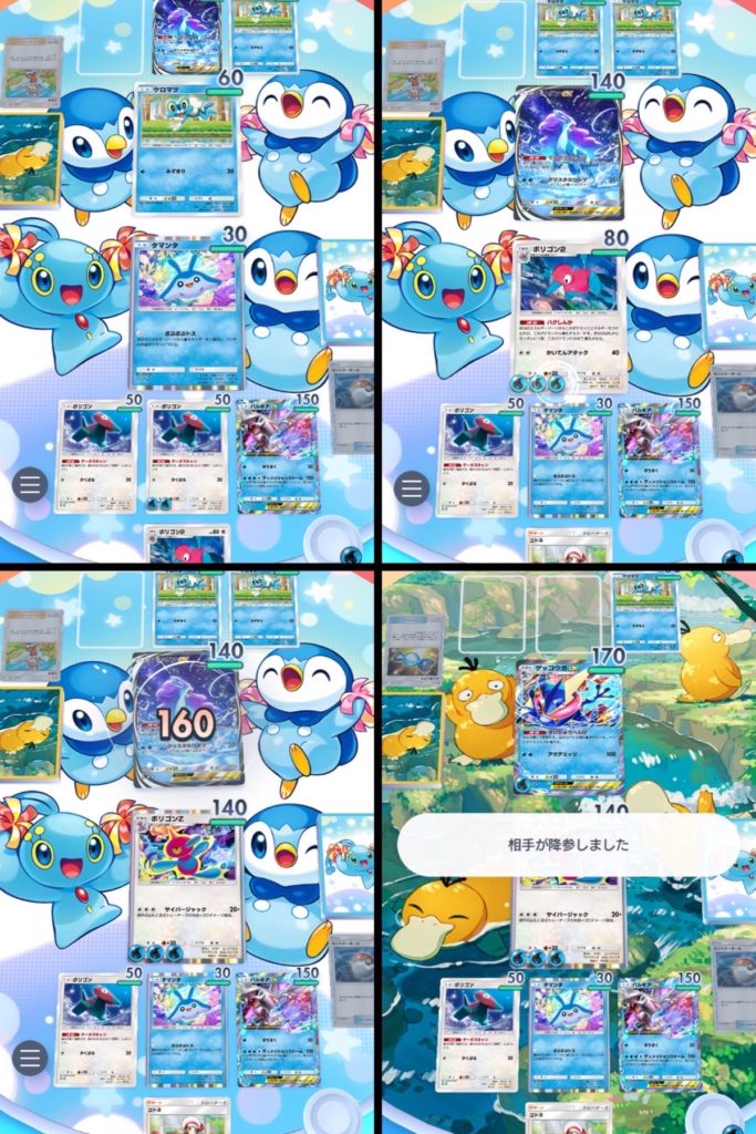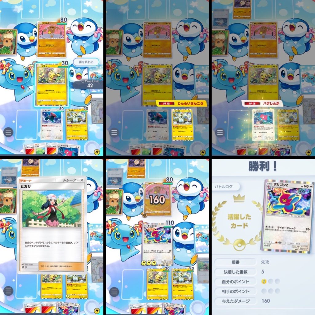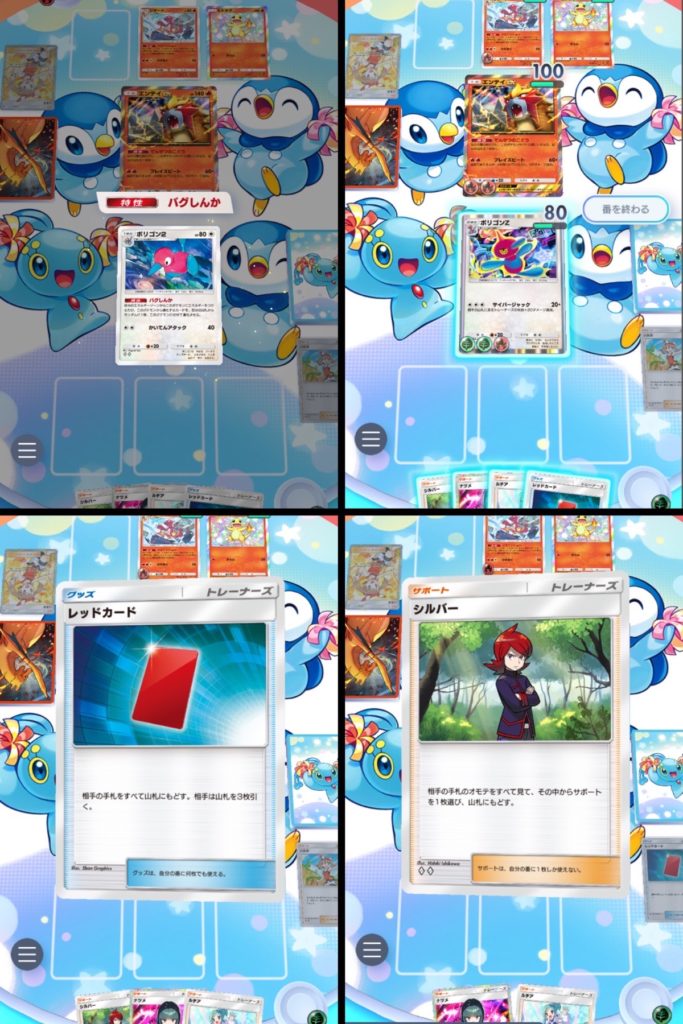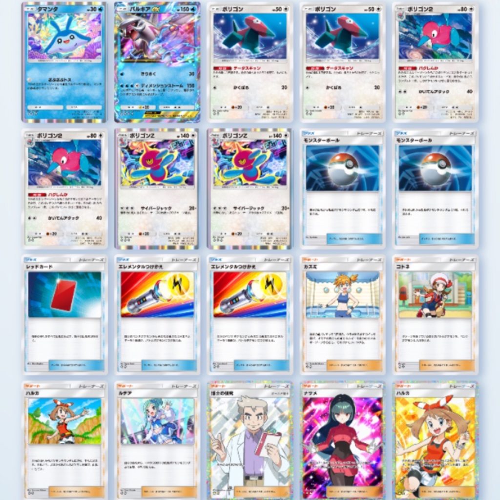 強い点:初手にタマンタ(バトル場)、ベンチにポリゴンがいるパターンで更にカスミ、エレメンタルつけかえ、ポリゴン2が揃うと最速ムーブ先攻2ターンでサイバージャックを打てる可能性があります。